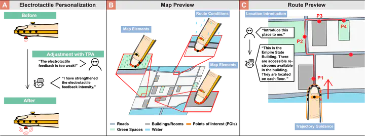 Previewing routes to unfamiliar destinations is a crucial task for many blind and low vision (BLV) individuals to ensure safety and confidence before their journey. While prior work has primarily supported navigation during travel, less research has focused on how best to assist BLV people in previewing routes on a map. We designed a novel electrotactile system around the fingertip and the Trip Preview Assistant (TPA) to convey map elements, route conditions, and trajectories. TPA harnesses large language models (LLMs) to dynamically control and personalize electrotactile feedback, enhancing the interpretability of complex spatial map data for BLV users. In a user study with twelve BLV participants, our system demonstrated improvements in efficiency and user experience for previewing maps and routes. This work contributes to advancing the accessibility of visual map information for BLV users when previewing trips.